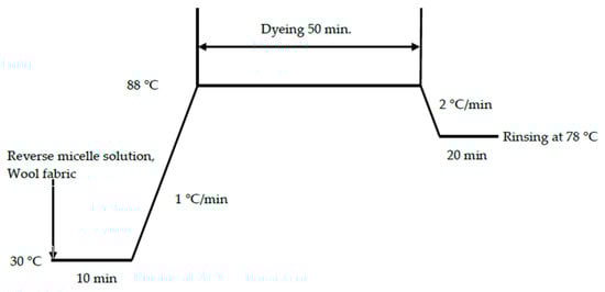 Woven wool plain fabrics (73 warps per inch × 60 wefts per inch) were firstly immersed in acetone (GR grade, Duksan, Gyunggido, Korea) for 5 min and then rinsed with 2 g/L soap. After soaping, the fabrics were washed in cold water and then air-dried at room temperature. The air-dried fabrics were then conditioned for at least 24 h at 20 ± 2 °C and relative humidity of 65 ± 2% prior to further experiment. The non-ionic surfactant, poly(ethylene glycol) (12) tridecylether (C13H27(OCH2CH2)12OH) was used (reagent grade, Sigma Aldrich, St. Louis, MO, USA). Octane and nonane (reagent grade, ACROS, Fair Lawn, NJ, USA) were used as the dyeing media and n-octanol (reagent grade, Alfa Aesar, Heysham, UK) was used as a co-surfactant in the dyeing process. Acetic acid (reagent grade, Sigma Aldrich, St. Louis, MO, USA) and sodium sulfate (reagent grade, Sigma Aldrich, St. Louis, MO, USA) were used in conventional aqueous dyeing. Realan reactive dyes (Realan Red EHF, Realan Yellow EHF, and Realan Blue EHF, Dystar, Shanghai, China) were used directly without further purification.