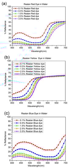 Percentage of reflectance value vs. wavelength (nm) of wool fibers dyed by (a) Realan Reactive Red, (b) Realan Reactive Yellow, and (c) Realan Reactive Blue in water.
