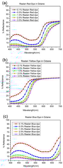 Percentage of reflectance value vs. wavelength (nm) of wool fibers dyed by (a) Realan Reactive Red, (b) Realan Reactive Blue, and (c) Realan Reactive Yellow in octane.