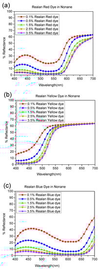 Percentage of reflectance value vs. wavelength (nm) of wool fibers dyed by (a) Realan Reactive Red, (b) Realan Reactive Yellow, and (c) Realan Reactive Blue in nonane.