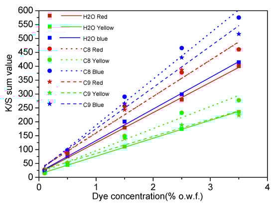 Calibration curves of the red, yellow, and blue batch samples dyed in water and reverse-micellar octane and nonane media are illustrated in Figure 6. The K/Ssum values of red, yellow, and blue samples dyed in the reverse-micellar system were higher than those in water system, indicating that the octane and nonane dyeing system can obtain better color yield than the water-dyeing system.