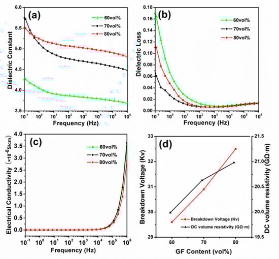 - The electrical insulating properties of the composite material are enhanced with the increase of GF content. The breakdown voltage of the composite materials having a fiber content of 60 vol.%, 70 vol.%, and 80 vol.% was 29.6, 30.9, and 32.5 KV, and the DC volume resistivity was 19.978, 20.629 and 20.981 GΩ·m, respectively.