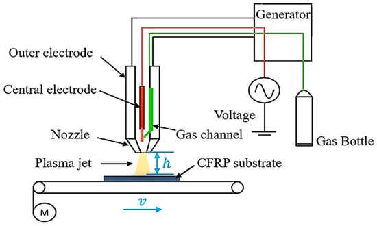 Schematic diagram of atmospheric pressure plasma treatment for the modification of CFRP surface.