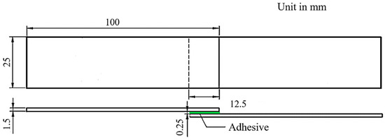 The size of lap-shear adhesive-bonded joint sample is shown in Figure 3 and the fabrication processes are as follows: (1) Cleaning the bonding areas of two CFRP substrates with acetone; (2) Applying the adhesive onto the bonding area of either of the substrates by using an injection gun; (3) Scattering a layer of glass balls (0.25 mm in diameter) on the adhesive surface to control the thickness of the adhesive layer; (The glass balls remain in the final adhesive-bonded joint.) (4) Applying pressure via the fixture and removing the excessive adhesive outside the bond area; (5) Examining joint quality to ensure the consistency of tensile testing results, and then curing the joints in an oven at 40 °C for 2 h per supplier’s recommendation.