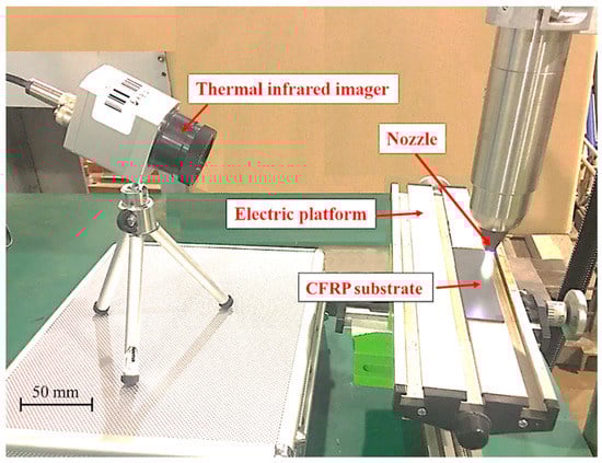 A thermal infrared imager (Optris-PI400) was used to measure CFRP substrate surface temperature via thermal radiation during APPT as shown in Figure 4. It can be connected to a computer via a USB connector and operated in Optris PI Connect software. The applied sampling frequency of the thermal infrared imager is 80 Hz and temperature measurement error is 2 °C. The material emissivity of CFRP is 0.85. In this study, the average temperature of the area directly under the nozzle (i.e., a circle with a diameter of 4 mm) was used as the surface temperature of CFRP substrate during the APPT.