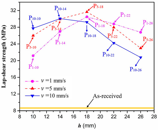 To evaluate the effect of APPT on the bonding strength, adhesive bonded CFRP joints were fabricated and lap-shear tensile tests were conducted. Figure 5 presents the lap-shear strength of adhesive-bonded CFRP joints as a function of and . It can be seen that the lap-shear strength of adhesive-bonded joints fabricated from as-received CFRP substrates was only 8.6 MPa. When was 1 mm/s, the lap-shear strength of adhesive-bonded joints fabricated from plasma-treated CFRP substrates ( CFRP joints) increased from 21.2 MPa to 30.5 MPa as increased from 10 mm to 18 mm. While was beyond 18 mm, the lap-shear strength of plasma-treated CFRP joints decreased nearly linearly with an increase of . Similar effect of on the lap-shear strength of CFRP joints was observed as was set to 5 mm/s, at which the lap-shear strength of CFRP joints reached a peak value of 31.6 MPa when was 18 mm. When was 10 mm/s, the lap-shear strength of CFRP joints increased from 27.7 MPa to 29.7 MPa as increased from 10 mm to 14 mm, then decreased continuously with a further increase of . Compared with the as-received CFRP joints, the lap-shear strength of P1-18 and P10-14 CFRP joints had an increase of 255% and 245%, respectively, which are slightly lower than that of P5-18 CFRP joints (267%).