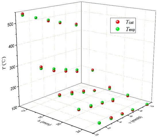 In order to understand how the plasma processing parameters affect the surface temperature of CFRP substrate (), was measured by a thermal infrared imager when the CFRP substrate was treated by plasma equipment with different and , and the measured temperatures are presented in Figure 6. From Figure 6, it can be seen that the highest occurred at the smallest and the lowest . It is found that showed a more significant effect on the than . When was 1 mm/s, decreased from 538 °C to 132 °C as the increased from 10 mm to 26 mm. When was 10 mm, the decreased from 538 °C to 437 °C as the increased from 1 mm/s to 10 mm/s. In addition, the effect of on the decreased with increasing . When was 26 mm, the decreased by only 30 °C as the increased from 1 mm/s to 10 mm/s. It is found that can be expressed as an function of and , i.e., Equation (1), and the goodness of fit for is characterized by the mean square root (MSR) error and maximum deviation (MD). Based on Equations (2) and (3), the MSR error and MD between the calculated temperature by Equation (1) and is 5.3 °C and 9.0 °C, respectively. Figure 7 shows that the empirical model (Equation (1)) is capable of providing a satisfied prediction to the surface temperature of CFRP substrate at least within the investigated ranges of and .