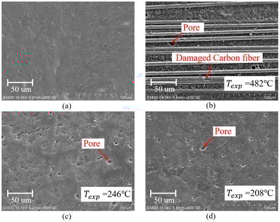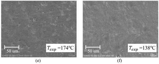 To examine the morphological changes in the surface of plasma-treated CFRP substrate, scanning electron microscopy (SEM) observations were performed. Figure 8a–f present the surface morphologies of the as-received and plasma-treated CFRP substrates (i.e., P5-10, P5-14, P5-18, P10-14, and P10-18 CFRP substrates). From Figure 8a, it can be found that the surface of as-received CFRP substrate is relatively homogeneous and smooth, but there are some tiny pores having a diameter of smaller than 2 μm on the surface of the epoxy resin. When of 5 mm/s and of 10 mm were applied to treating CFRP substrate, it can be observed from Figure 8b that the epoxy resin on the surface of P5-10 CFRP substrate (with = 482 °C) was removed and carbon fibers on the outermost layer were exposed and had minor damage. A lot of pores larger than 5 μm in diameter on the epoxy resin of P5-14 (with = 246 °C) and P10-14 (with = 208 °C) CFRP substrates were observed, as shown in Figure 8c,d, respectively. Some scholars have reported that double bonds can be formed by eliminating water in epoxy resin molecules at the temperature higher than 120 °C [25], which may create larger and deeper pores on the original pores or create new pores in the surface of the epoxy resin. The surface morphologies of P5-18 (with = 174 °C) and P10-18 (with = 138 °C) CFRP substrates were nearly the same as that of the as-received CFRP substrate shown in Figure 8e,f. Therefore, it is suggested that there is little thermal damage occurred on the CFRP substrates when the surface temperature of CFRP substrate during APPT is below 174 °C.