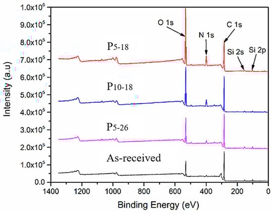 To study the chemical element changes caused by APPT on CFRP substrates, X-ray photoelectron spectroscopy (XPS) was used to detect the surface chemical compositions of the as-received and plasma-treated CFRP substrates (i.e., P5-18, P10-18, and P5-26 CFRP substrates). Figure 9 presents the high resolution XPS scanning results of Si2s, Si2p, C1s, N1s, and O1s. The content of each element of interest is listed in Table 6. It can be seen from the table that compared with the as-received substrate, the content of Si element on the P5-18, P10-18 and P5-26 CFRP substrate surfaces was reduced by 70%, 51%, and 15% after APPT, respectively. The Si element, mainly existing in the form of –(CH3)2Si–O–, is one of the components of the release agent, which acts as surface contamination on the CFRP substrate blocking the bonding of the adhesive and epoxy resin [26]. From the reduced Si contents on the plasma-treated CFRP substrate surfaces, the contaminations on the CFRP substrate surface can be removed more completely by APPT when a smaller or a slower was applied. Comparing the contents of O and N elements on the P5-18 and P5-26 CFRP substrate surfaces, it can be found that when was increased from 18 mm to 26 mm, the contents of oxygen and nitrogen dropped by 56% and 45%. While was fixed at 18 mm and was increased from 5 mm/s to 10 mm/s, it is observed that the contents of oxygen and nitrogen dropped by 21% and 39%. This suggests that the increase of either or results in reducing the contents of both oxygen and nitrogen on the plasma-treated CFRP substrate surface.