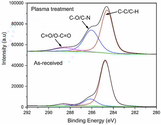 Figure 10 shows the carbon functional groups XPS analyses of the as-received and plasma-treated (i.e., P5-18 CFRP substrates, the chemical element change on the surface is most obvious) CFRP substrates surface. The peaks at 288.7 eV and 286.2 eV are attributed to C=O (or O–C=O) and C–O (or C–N), respectively, and the peak at 284.7 eV is representative of C–C (or C–H). Table 7 shows the content of carbon functional groups. It can be observed that after APPT with = 5 mm/s and = 18 mm, the C=O/O–C=O bond content of CFRP substrate surface was increased by 118.4%, the C–O/C-N bond content of CFRP substrate surface was increased by 139.5%, while the C–C/C–H bond content of CFRP substrate surface was decreased by 31.7%.