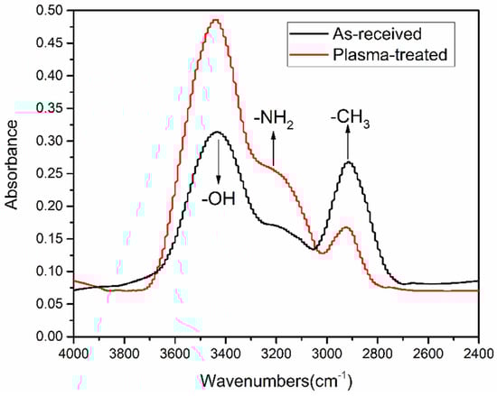 FTIR was performed to further analyze surface modifications of plasma-treated CFRP substrates as well as to identify what functional groups contribute to improve interface bond strength. Except for the observed differences within the range from 2600 to 3800 cm−1, the overall absorbance of P5-18 CFRP substrate surface was almost the same with the as-received substrate surface. Figure 11 presents a compilation of the spectra as an effect of APPT within this range. The absorption between 2800 and 3000 cm−1 is related to –CH3, which is typically quite stable on the surface of the as-received CFRP substrate even after curing process of CFRP sheet or acetone-cleaning. However, after APPT –CH3 groups appeared to become oxidized and the intensity decreased. In addition, the absorptions at 3500 cm−1 and 3300 cm−1 are associated with –OH and –NH2, and both had a significant increase in intensity.