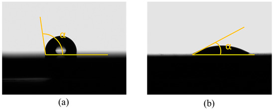 To examine the effect of APPT on wetting characteristics of CFRP substrates, the contact angles of as-received and P5-18 CFRP substrates were compared. Before measuring contact angles, as-received CFRP substrates were cleaned with acetone and dried in laboratory environment. The wettability of CFRP substrates can be evaluated through the measured contact angles of the substrate surfaces [27]. As listed in Table 8, APPT decreased the contact angles for all test liquids (i.e., distilled water, ethylene glycol, and diiodomethane). When distilled water was used as the test liquid, the contact angles of as-received and P5-18 CFRP substrates were presented in Figure 12. The contact angle of the as-received CFRP substrate was measured as 108.6°, while the contact angle decreases to 32.4° after APPT with = 5 mm/s and = 18 mm (i.e., the P5-18 CFRP substrate). These results indicate that the surfaces of CFRP substrates became more hydrophilic after APPT. Similar experimental phenomena were observed in previous reports [28,29].