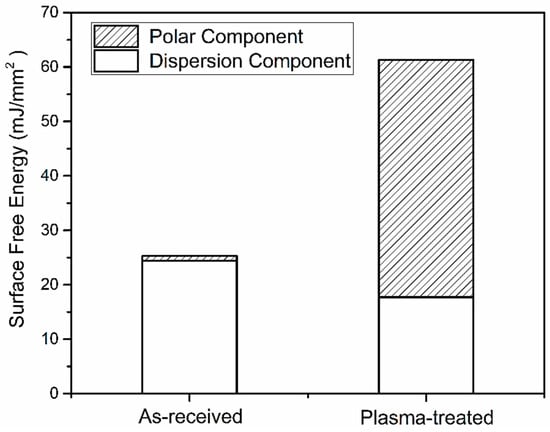 To further evaluate surface wetting properties, the surface free energy (SFE) of CFRP substrates, expressed by Equation (4), was calculated based on the Owens–Wendt method [30,31]. Figure 13 presents the surface free energy consisted of corresponding polar and dispersion components. The SFE of the P5-18 CFRP substrate increased significantly compared to the as-received substrate, which agrees well with the reported results based on other plasma pretreatment methods [32]. The SFE of the P5-18 CFRP substrate reached up to 61.33 mJ/m2 and was enhanced by 36.81 mJ/m2 compared to that of the as-received CFRP substrate. Referring to Figure 13, the enhancement of SFE of the P5-18 CFRP substrate is mainly due to the increase of its polar component.