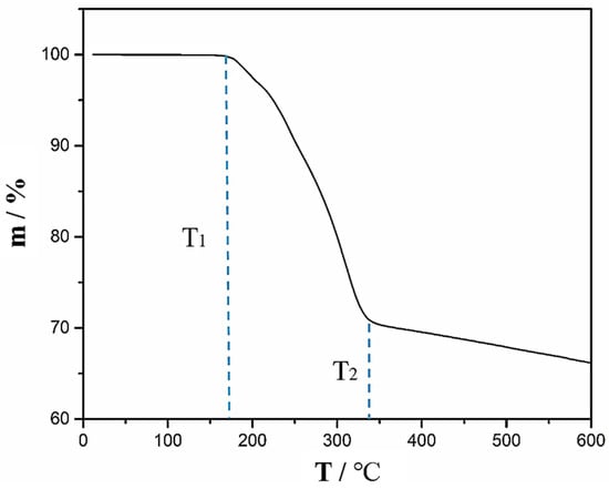 To study the effect of temperature on the CFRP substrate, the epoxy resin of CFRP was tested by DSC. The DSC testing result is presented in Figure 14. From Figure 14, it can be seen that the cured epoxy resin has an endothermic peak at 194.5 °C and the initial temperature of the endothermic peak is 175.3 °C. This indicates that the epoxy resin started to react chemically as the temperature reached 175.3 °C. Figure 15 presents the weight of CFRP substrate (m) changes as a function of temperature. The weight of the CFRP substrate started to decrease as the temperature was above T1 (~170 °C). When the temperature reached T2 (~340 °C), the epoxy resin in the CFRP substrate was almost fully pyrolysed.