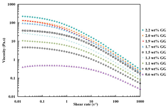 As depicted in Figure 1, the apparent viscosity of GG solutions at each shear rate strongly depended on its concentration, in general increasing as concentration increased. The flow curves were carried out at 50 °C. In all cases, GG solutions exhibited typical non-Newtonian (pseudoplastic) behavior with increasing shear rate (> s−1), in which the shear viscosity reduced with shear rate and became noticeable with increasing GG concentration, displaying shear thinning property. Similar results were reported by Martín-Alfonso [38] and Torres et al. [34]. Shear thinning is often explained to be the result of breakdown of interchain interactions in the polymer network, i.e. random movement of polymer chains become more progressively limited as the concentration increases and consequently the rate to reform new entanglements is lower than those unwinding under high shear stress, resulting in a decrease interaction in the polymer network as the concentration increases [39,40].
