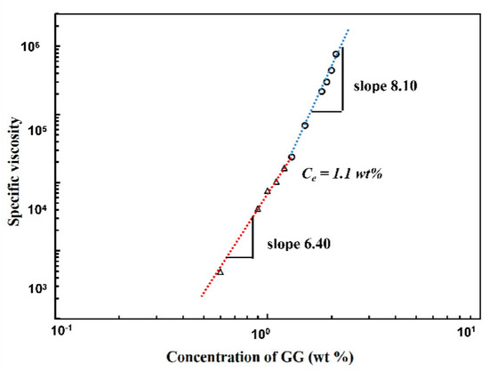 Flow curves of GG solutions mentioned above showed a satisfactory fitting with the Cross–Williamson model (R2 > 0.99) in the shear rate range and the resultant zero-shear viscosities η0 were used to further obtain specific viscosity values. By using the specific viscosity, chain entanglement concentration Ce was calculated from the plots of specific viscosity ηsp data versus the GG concentration in double logarithmic coordinate for these polysaccharide solutions [35,41,42]. In electrospinning process, Ce is the minimum concentration before attaining stable electrospinning, with possible fabrication of uniform bead-free nanofibers [43,44]. As shown in Figure 2, the Ce was determined to be ~1.1 wt % for the GG solution from the crossover of two different linear intervals. At low concentrations, specific viscosity ηsp ~ c 6.4 was observed, indicating GG solutions in this range were in semi-dilute unentangled state, in which the chain overlap between individual molecules was insufficient to form any notable degree of entanglement. Above Ce, a notable increase in gradient was obtained and reached a constant slope of 8.10, suggesting the entrance of the semi-dilute entangled regime. The Ce detected in this study was slightly higher than Torres’s report, where GG concentrations between 5 and 10 g/L were suggested to be in the entangled regime when the test was carried out at 20 °C. The variation of Ce might due to the difference of sample temperature under test.