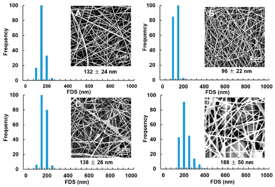 SEM images and fiber diameter size (FDS) of electrospun fibers obtained from GG solutions at 2 wt % concentration loaded with: 5 wt % TA (A); 10 wt % TA (B); 15 wt % TA (C); and 20 wt % TA (D). Magnification is 10,000×.