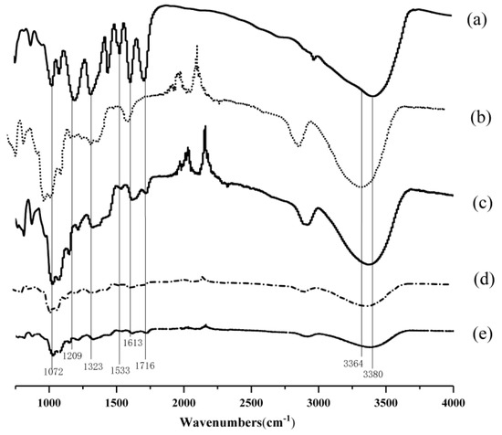To assign intermolecular interactions between TA and GG, as-spun GG fibrous mats with and without incorporating TA were characterized using FT-IR spectra. In Figure 5, Curves a and b refer to the spectra of TA powders and neat GG fibrous mats, respectively, while Curves c–e represent the spectra of GG fibrous mats incorporated with 10, 15, and 20 wt % TA, respectively. The characteristic absorption peak of TA was identified using FT-IR examination (Figure 5, Curves c–e vs. Curve a) through the presence of C=O stretching vibration of ester group (1716 cm−1), aromatic –C=C– stretching vibration (1613 and 1533 cm−1), and O−H stretching of alkylphenol (1323 cm−1), indicating the presence of TA loaded on electrospun GG fibrous mats.