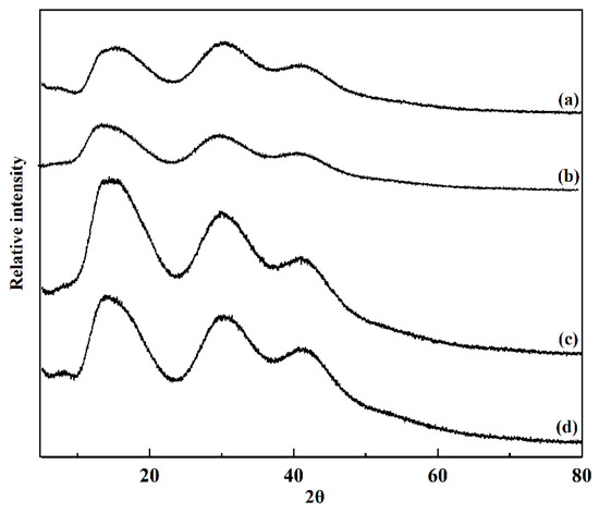 The crystallinity of GG and GG-TA fibrous mats after electrospinning, as tested by XRD, is shown in Figure 6. The broad peak observed in Figure 6 indicates that neat GG exhibited low viscosity. Similar results are reported for native GG solutions [47,48]. The shape and position of the GG-TA 10% (Figure 6, Curve b), GG–TA 15% (Figure 6, Curve c), and GG–TA 20% (Figure 6, Curve d) peaks did not change when compared to the neat GG fibrous mats, which suggested that TA does not have a distinct effect on the crystallinity property of GG.