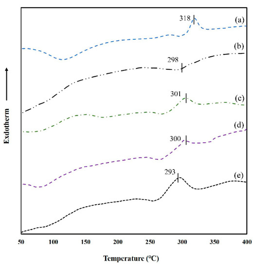 The thermal behavior of neat GG and GG-TA fibrous mats was investigated by DSC method, as depicted in Figure 7, and GG powder exhibited two endothermic peaks (278 and 318 °C), which correspond to similar thermograms that show the peaks occurring at 257.81–261.95 °C and 302.46–311.57 °C (Figure 7, Curve a), as reported by Razmkhah [50]. However, the neat GG fibrous mat exhibited only one exothermic peak (298 °C). This was attributed to the orientation effect, due to the high speed elongation and rapid solidification during electrospinning [51] (Figure 7, Curve b). All of the GG-TA fibrous mats showed a major degradation curve at around 300 °C (Figure 7, Curves a–c), which can be explained as the result of the disintegration of the polysaccharide backbone.