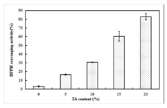 The antioxidant properties of the fibrous mats were evaluated by DPPH tests and the results, representing DPPH scavenging activity, are depicted in Figure 8. These results indicate that TA maintains inhibition activity after blending and being electrospun with GG. The DPPH scavenging activity of the TA loaded GG electrospun membranes changed from 16.6% to 80% when TA concentration increased from 5% to 20%, while the neat GG fibrous mat only exhibited a weak influence (3.5% of inhibition) on the DPPH solutions. A ~ 22 times enhancement was observed at 20 wt % TA loading in contrast with the control sample of GG without TA (p < 0.05), indicating a positive correlation between the content of loaded TA and the increase in the DPPH scavenging capacity.