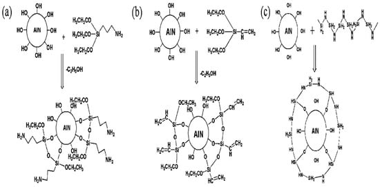 Schematic representation of the surface-treated AlN nanoparticles. (a) APTES-AlN, (b) VTES-AlN, and (c) PSZ-AlN.
