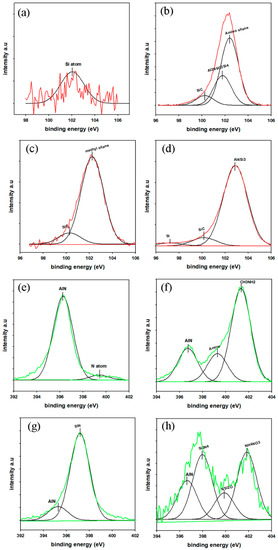 Si2p (top) and N1s (bottom) deconvoluted XPS spectrum of (a,e) raw AlN, (b,f) APTES-AlN, (c,g) VTES-AlN, and (d,h) PSZ-AlN.