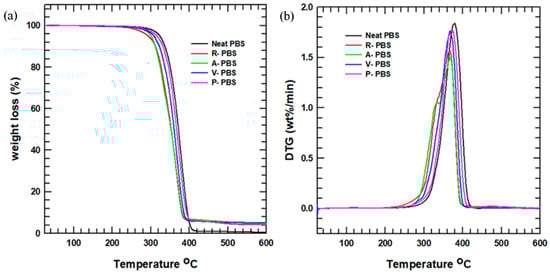 (a) TGA curve of the neat PBS and its composites; (b) Derivative thermogram curves of TGA.