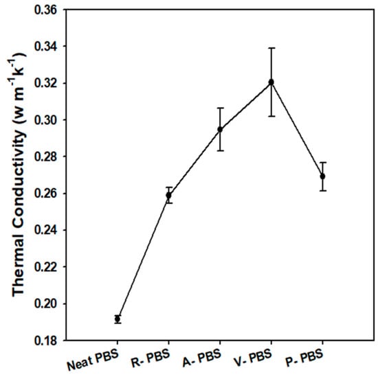 The thermal conductivity of the tested samples of neat PBS and its nanocomposites is shown in Figure 7. The thermal conductivity of a specimen measured using the flash laser method is dependent on the three parameters shown in equation 2. The thermal diffusivity and specific heat capacity of each sample is presented in Table S3. The specific heat capacity exhibited a small drop with the inclusion of AlN nanoparticles while the density of the nanocomposites became higher than the neat PBS. Therefore, the product of specific heat capacity and density was almost the same for each sample. Thus, the thermal conductivity of each sample was mainly dependent on the change in the thermal diffusivity of the corresponding sample. As expected, the thermal conductivity of the neat PBS was too low: <0.2 W m−1 k−1. The incorporation of the thermally conductive AlN nanoparticles increased the thermal conductivity of the fabricated PBS/AlN nanocomposites. Among the nanocomposites, V-PBS had the highest thermal conductivity, 67.3% higher than that of the neat PBS. Considering only 5 wt % AlN nanoparticles was added, the enhancement on thermal conductivity of the PBS composites is promising. This improvement of the thermal conductivity is attributed to two main factors. First, the incorporation of raw AlN into the matrix formed a network owing to the attractive force generated between the nanoparticles (Figure S3c). This caused the thermally conductive nanocomposites to transport heat more easily compared with the neat PBS [35]. The second factor was the improved interfacial interaction and dispersion of treated AlN nanoparticles (Figure S3b) [36]. For instance, the VTES-AlN-treated nanoparticles had more unsaturated (C=C) bonds on the surface than the raw AlN, which makes them more reactive to bond formation with the PBS matrix. As a result, these treated AlN nanoparticles formed good adhesion with the matrix. Generally, the inclusion of treated AlN nanoparticles improved the thermal conductivity of the nanocomposites.