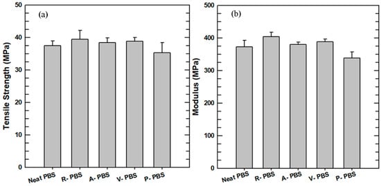 The tensile properties of the neat PBS and its composites were investigated using the UTM. The results for the tensile strength and Young’s modulus are presented in Figure 8. The tensile strength exhibits a small increase for R-PBS, A-PBS, and V-PBS compared with the neat PBS. Previous studies [37,38] showed that there is usually a decrease in the tensile strength of composites with the addition of ceramic fillers. However, in this study, the tensile strength of the PBS nanocomposites did not decrease with the incorporation of AlN. This result is mainly due to the change in the degree of crystallinity of the nanocomposites. The degree of crystallinity has an inverse effect on the tensile strength of the nanocomposites. As the level of crystallinity increases, the stress–strain transfer at the interface between the PBS and the AlN nanoparticles decreases. Among the samples investigated in this study, the neat PBS had the highest degree of crystallinity and lowest tensile strength.