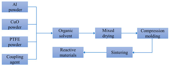 Figure 1. The addition of CuO powder is mainly used to promote the chemical reaction between the reactive materials and to increase the density of the reactive materials. The particle sizes of the raw materials include PTFE powder (350 nm and 35 μm), Al powder (50 nm and 5 μm) and CuO powder (50 nm and 10 μm). The instruments required for the experiment include a tablet press, an ultrasonic disperser, a tubular vacuum sintering furnace, a mixing mixer, a vacuum drying oven, and an electronic scale. The preparation and sintering process of the PTFE-based reactive materials is shown in