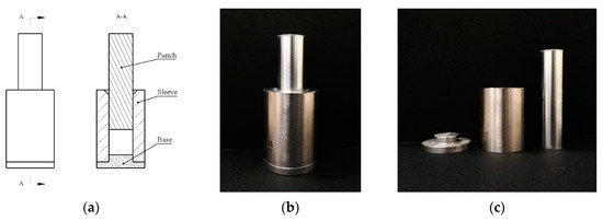 Figure 3. The whole pressing mold consists of three parts: the punch, the sleeve, and the base. To facilitate the filling of materials into the mold, a bell mouth is milled on the upper end of the sleeve. At the same time, in order to reduce the cracks caused by the expansion during the demolding process, a small chamfer is also milled at the lower end of the sleeve. It is worth noting that due to the poor fluidity of PTFE, the material will remain on the inner wall of the sleeve during the compression process, and the inner wall of the sleeve needs to be cleaned over time. If the cleaning is not timely, the friction between the punch and the inner wall is greatly increased, making the punch and the base difficult to remove. The effect is more obvious when the pressing pressure is higher. In addition, the coaxiality of the mold should be retained as much as possible during the pressing process.