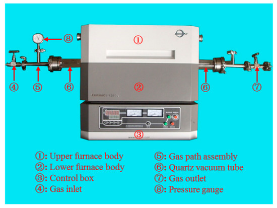 Figure 5. The tubular electric furnace uses 0Cr27Al7Mo2 electrothermal alloy as the heating element. The furnace adopts a PMF (Polycrystalline Mullite Fiber) ceramic fiberboard with low thermal conductivity and less heat storage, and the working temperature in the furnace can reach 1200 °C. In addition, it has the characteristics of fast heating and a uniform furnace temperature. It also functions with programmed temperature and vacuum pump controls, and the temperature control system uses the programmed control instrument + K type thermocouple. Through the feedback mechanism, the temperature in the furnace can be measured, displayed, and controlled so that the temperature in the furnace can run automatically according to the pre-set heating curve with high control accuracy. The protection system adopts both over-temperature and leakage protections, and the double protection provides a reliable guarantee for the safety of users. The over-temperature protection can ensure that the power supply of the heating element can be automatically cut off when the actuator fails and the furnace temperature cannot be controlled. The leakage protection ensures that the total power of the equipment can be automatically cut off when the insulation of the electric furnace is damaged. Before pumping the vacuum tube, it is necessary to check whether the suction port and the vacuum control system are properly connected. When vacuuming, the vacuum pump should be turned on first, and then the heating is turned on when the inside of furnace tube is under the vacuum.