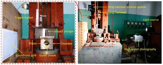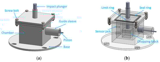Figure 10. The internal dimensions of the chamber are 100 mm × 100 mm × 110 mm, the size of the chopping block is 50 mm × 50 mm × 45 mm, the inner diameter of the guide sleeve is 30 mm × 100 mm, and the size of the impact plunger under the upper-end cover is 30 mm × 52 mm + 40 mm × 8 mm.