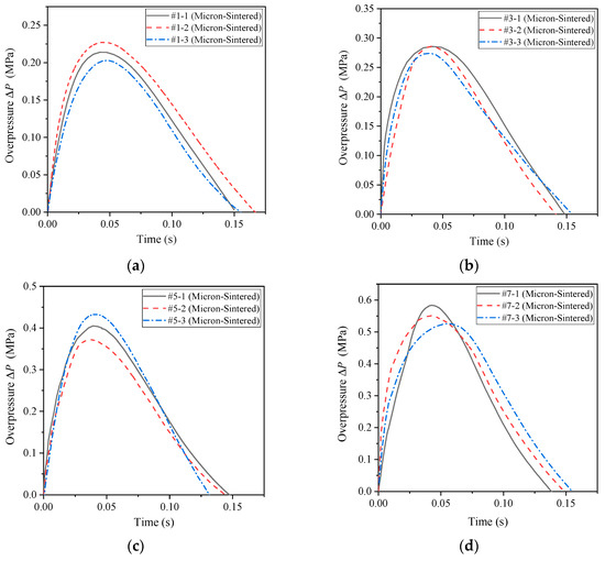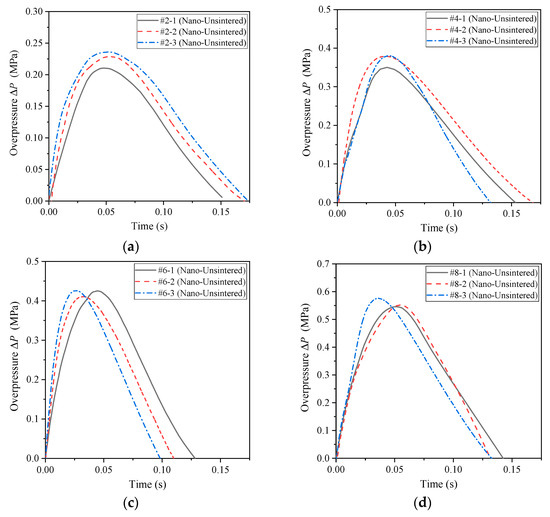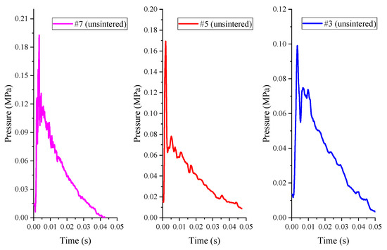 Figure 8 that after the reactive material reacted in the container, the shock wave was first generated, and then the quasi-static pressure formed in the container. In engineering research, the main concern is the quasi-static pressure value of the second half. Therefore, when dealing with the measured pressure time history curve, the data of the initial shock wave was not analyzed, and only the second half of the data was retained for analysis. By using the data analysis software Origin (OriginLab, Northampton, MA, USA) to process the measurement curves, the pressure time history curves of the sintered micron-scale PTFE-based reactive materials measured by the pressure sensor were obtained, as shown in