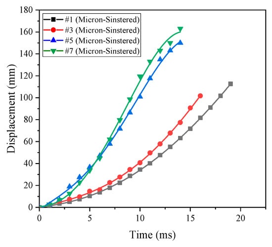 Figure 12. This phenomenon indicates that only a very small portion of the reactive materials reacted for the unsintered PTFE-based reactive materials. That is to say, under this drop weight condition, the energy release rate of the micron-scale PTFE-based reactive material was very low. Although the overpressure value was small, we can still see that the three sets of overpressure peaks corresponded to the following relationship: #7 > #5 > #3. This shows that the increase in thermite content helps to promote the reaction of the reactive materials. More importantly, the overpressure in the container is not enough to push the piston to overcome the frictional force of the system, so the displacement time curve cannot be reversed. In addition, raising the drop hammer to the maximum height of 2.5 m did not significantly increase the energy release of the reactive materials.