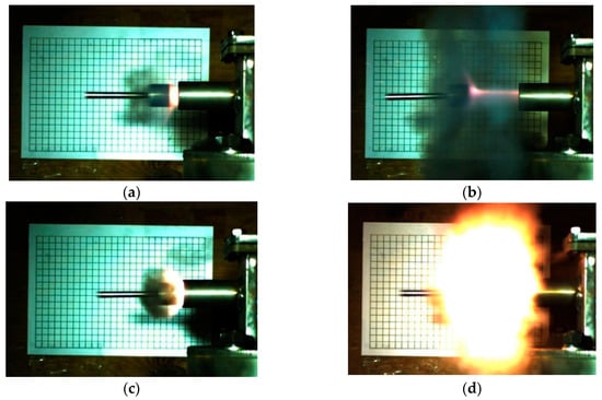 Figure 15, we can see a large amount of black smoke following the piston and a small amount of flare. This indicates that the reactive materials reacted inside the cavity, but the reaction was not sufficient. After analysis, the black smoke mainly contained unreacted reactive material powder and some formed products.