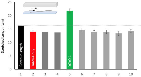 Figure 1 compares surface-tethered DNA molecules dependent on the staining reagents. First of all, TAMRA-polypyrrole stained DNA (2 in Figure 1) stretched up to 14.03 ± 0.54 µm (X/L = 86% ± 3%) at 100 µL/min within 100 µm high flow cell [29]. Previously, we calculated the force of 0.79 pN applied to the λ DNA in the same flow cell (100 µL/min) [27]. Based on this value, we checked Bustamante’s paper, in which they measured DNA stretches versus the force by optical tweezers. From their graph, we obtained 85% stretch (3 in Figure 1), which agreed with our previous prediction of 84% (4 in Figure 1). In contrast, YOYO-1 stained DNA (5 in Figure 1) stretched up to 21.8 ± 0.72 µm (X/L = 134% ± 4.4%), which is significantly larger than other stretches. However, it is notable that this stretch would be 88% ± 3% compared with Murade’s contour length (24.67 µm) for YOYO-1 stained DNA [28]. For comparison, we added DNA stretches stained by FP-DBPs (DNA binding peptides) from 6 to 10 in Figure 1 [21,27]. Figure 1 suggests that TAMRA-polypyrrole stained DNA preserves the contour length of natural B-form DNA, while YOYO-1 stained DNA changes it considerably. Therefore, we would like to use the contour length (L) of natural B-form DNA for the remaining part of this paper, such as 16.3 µm for λ DNA (48,502 bp × 0.337 nm/bp) and 55.8 µm for T4 DNA (165,644 bp × 0.337 nm/bp).