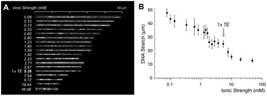 Figure 2 demonstrates that DNA stretch varies according to the ionic strength. The persistence length (p) is dependent on the ionic strength (I). A well-known theory is the Odijk, Skolnick and Fixman equation (OSF equation) given by [39,40].