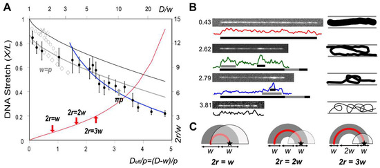 DNA stretch ratio (X/L) dependent on p and w: (A) The black line was drawn by Equation (11) and the gray line was down-shifted by 0.13 (Equation (12)). The gray symbols were obtained from other references: X: 38 nm nanochannel experiment [49]; open circles: simulation for ; open diamond: simulation for [50]. The blue line was the best fit for the de Gennes regime (Equation (14)). The red line represents 2r/w where r is the hairpin radius (Equation (13)); (B) Microscopic DNA images and its intensity profiles at four data points representing the unfolded, backfolded, knotted and random chains. The corresponding Deff/p is also shown on the left side of each image; 16bit clip images in supporting information. (C) Illustrations depict three cases for the ratio of the hairpin diameter, 2r, to the effective diameter, w. Stars and partially transparent semi-circles represent the DNA position and electrostatically repulsive regions defined by the effective diameter (w), respectively.