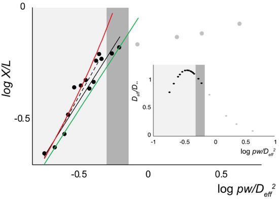 We included these two equations to compare the de Gennes regime as shown as the red and green lines in Figure 6. Here we assumed D as Deff in both Equations (16) and (17).