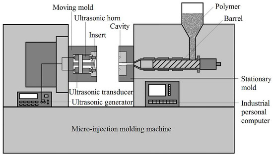 Generally, in the non-isothermal molding environment during μIM, the viscosity of the polymer melt could be decreased by increasing the mold temperature, melt temperature and injection speed, and the filling capability of melt and the replication quality of parts could be improved [11]. Some novel methods have been proposed to optimize μIM process parameters such as electric heating, steam heating, and infrared heating, which have been proposed for rapidly increasing the mold temperature [12]. However, the higher mold temperature, melt temperature, and injection speed would bring about more difficulties in the design and manufacture of the injection molding device; besides, these would also cause the waste of energy and decrease in molding quality [13,14]. To improve the molding quality of micropolymer parts without relying on a high standard of parameter adjustments, the ultrasonic vibration energy is brought into the micro-injection molding method.