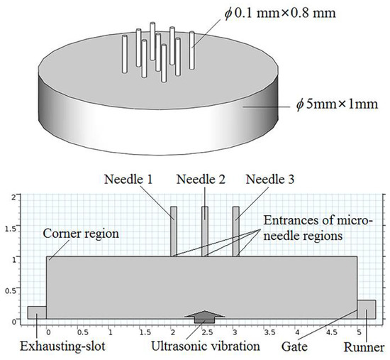 A numerical simulation of the melt flow field in the microneedle array cavity was carried out to clarify the specific effect mechanism and process of ultrasonic vibration on the mold filling quality. The model of the microneedle array part is as shown in Figure 2, in which each microneedle was 800 μm in height and 100 μm in diameter, and the volume of the part was approximately 19.68 mm3. Exhausting slots were set at the end of the cavity and the top of microneedles as in the actual processing. Based on flow simulation, the process of polymer melt flowing into the cavity was simulated. The theoretical fluid rheological models established in the previous work were taken in this simulation [21]. The melt flow velocity at the gate was set to be 6 m/s as the inlet boundary condition, and no additional pressure outlet boundary condition was set at the exhausting slot. PP was selected as an example, and other simulation parameters are consistent with the specific experimental parameters as shown in Table 1.