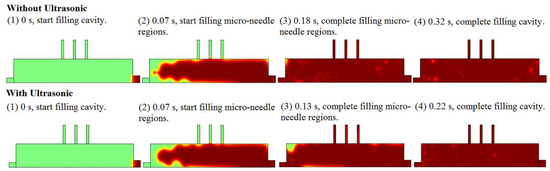 The filling process and volume fraction of melt in microneedle array cavity with and without the effect of ultrasonic vibration is shown in Figure 3 where the degree of red represents the volume fraction of the melt in the cavity. After the start of cavity filling, three time nodes are concerned, where they are the times the melt starts filling the microneedle regions, completes filling the microneedle regions, and completes filling the cavity. The criterion for filling completion is that there are no bubbles with a volume fraction of more than 50% in the region. It is shown that with the effect of ultrasonic vibration, the start times for filling the microneedle regions are the same, the time required to fill the microneedle regions can be reduced by 27.78% (from 0.18 s to 0.13 s), and the time required to fill the whole cavity can be reduced by 31.25% (from 0.32 s to 0.22 s). The shorter filling time can reduce the heat dissipation of the melt such that the melt can fill the cavity, especially the microneedle regions, with higher temperature and lower viscosity, which means achieving higher melt filling capability and less molding defects.