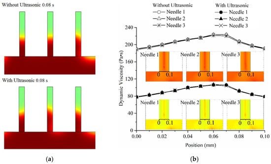 The melt filling and viscosity distribution of microneedle regions at 0.08 s with and without the effect of ultrasonic vibration: (a) the filling volume fraction of melt in micro-needle array cavity at 0.08 s with and without ultrasonic vibration, and (b) the melt viscosity distribution curves at the filling entrance transversal of microneedle regions with and without ultrasonic vibration.