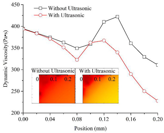 The melt viscosity distribution in the corner region with and without the effect of ultrasonic vibration.