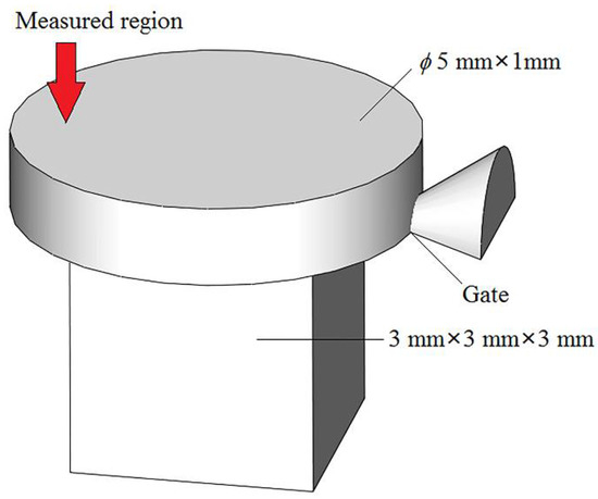 The measured mechanical properties of molded microneedle array parts were affected by various factors such as material properties, dimensional errors, and molding defects. In order to clarify the influence of ultrasonic vibration on the material properties of microneedle array parts, it is necessary to eliminate other factors in the injection molding affecting the measurement data. Therefore, the measurement of the needle portion had a large deviation, and the measurement of base portion can better clarify the effect of ultrasonic vibration on the material properties of microneedle array parts. LUμIM experiments were carried out using PP and PMMA materials with different excitation voltages of ultrasonic vibration, where the processing parameters are shown in Table 2, and the diagram of the shape, dimensions and the measured region of the base portion part is shown in Figure 6. The measured region is located approximately 1.5 mm away from the center of upper surface in the opposite direction to the gate. This location aims to avoid the unstable shear flow and microstructural distortion caused by the entrance effect near the gate, and on the other hand, to avoid the negative influence of possible sink marks near the center of the upper surface. Making nine measurements for each experimental condition, meanwhile ensuring more than five effective measurement results whose standard deviation coefficient is less than 5%, and subsequently taking the average of the effective measurement results, gave the final measurement result.