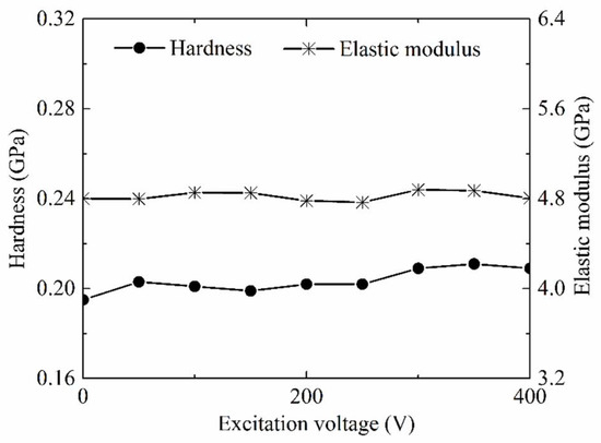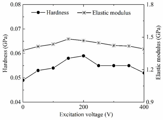 Effects of excitation voltage on the hardness and modulus of the PMMA parts.