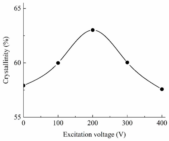 According to the measurement result of crystallinity in Figure 8, when the excitation voltage of ultrasonic vibration did not reach the optimal value, the destruction of ultrasonic vibration on the crystal structure was not significant yet, and the improvement of ultrasonic vibration on the crystallization rate played a major role and the crystallinity increased along with the increase of the ultrasonic vibration energy. When the excitation voltage of ultrasonic vibration exceeded the optimal value, the destruction of ultrasonic vibration on the crystal structure played a more significant role than the improvement of ultrasonic vibration on the crystallization rate, and thus the crystallinity decreased along with the increase of the ultrasonic vibration energy.