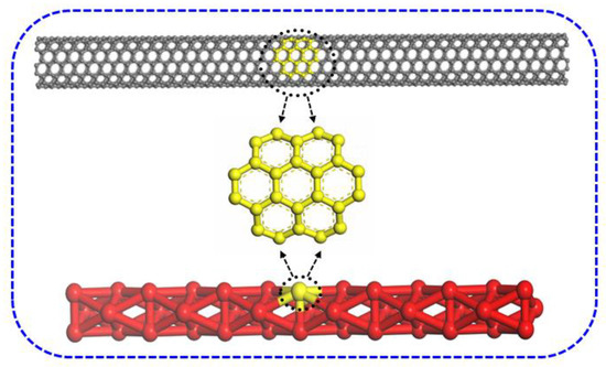 The coarse-grained model of single-walled carbon nanotubes (SWCNTs) (6,6) with a diameter of 8.14 Å and length of 103 Å is displayed in Figure 1, where 24 carbons are grouped as one particle. Every UHMWPE chain consists of 13,914 beads. The box contains 24,000 beads and the number density is kept as 3. The SWCNTs particle is stationary and treated as a rigid body. To incorporate rigidity in the bending of the nanotube, the bond length is taken as 0.75 DPD unit and the bond constant as 20 kBT for CNTs. The angle and angle constant for CNTs are taken as 180° and 40 kBT, respectively. The volume of the CNTs particle is about 480Å3. The solubility parameter of UHMWPE and SWCNTs is 16.50 and 18.69 (J/cm3)0.5, which is obtained from References [27,28], respectively. All the simulations were carried out for 1 × 105 steps with a time step of 1 fs in reduced DPD units.